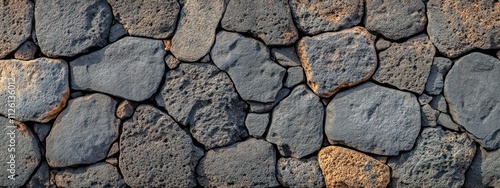 A textured wall made of various sizes of volcanic stones.