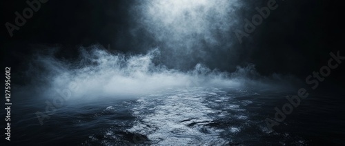 A thick blue fog fills the landscape, creating an ethereal atmosphere. Soft diffuse lighting highlights the mist, enhancing the mysterious mood of twilight.