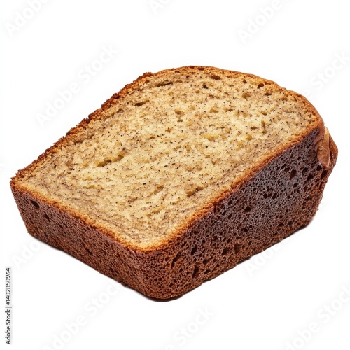 A thick slice of banana bread with a moist, tender crumb, a slightly crispy top