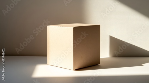 A thick, square cardboard box with a soft matte surface, casting subtle shadows on the white surface