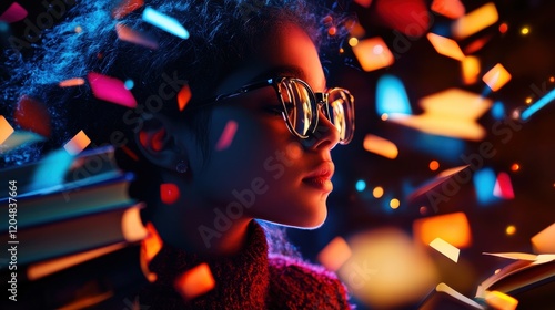 A thoughtful girl with glasses gazes into a colorful, vibrant backdrop of floating shapes, embodying creativity and wonder.