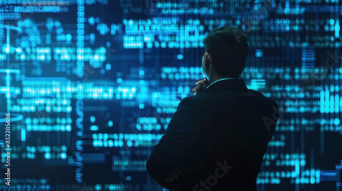 A thoughtful lawyer or policymaker in front of a digital screen displaying AI algorithms and legal codes, indicating the complexity of AI regulation and ethical considerations.