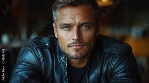 A thoughtful man in a stylish leather jacket poses in a studio, representing a creative worker in a trendy company.