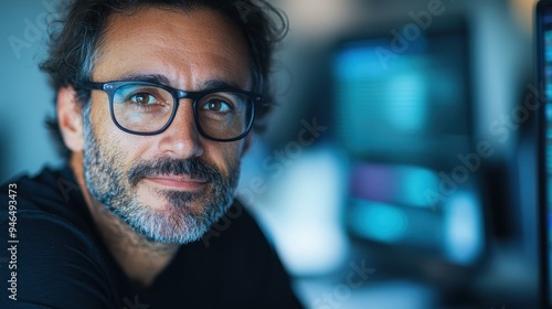 A thoughtful man with beard and glasses looks towards the camera in a tech workspace filled with monitors, embodying concentration and intellectual engagement in a professional setting.