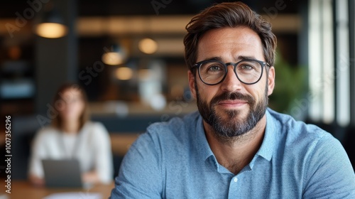 A thoughtful man with glasses sits in a comfortable workspace, embodying focus and professionalism, with blurred background and warm ambient lighting.