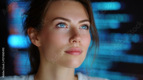 A thoughtful woman gazes upward, illuminated by vibrant digital lights, creating an atmosphere of contemplation and modernity.