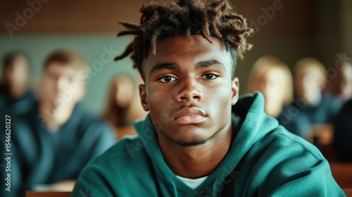 A thoughtful young student sits in a classroom, displaying deep concentration as he absorbs information from his surroundings and engages with his studies.