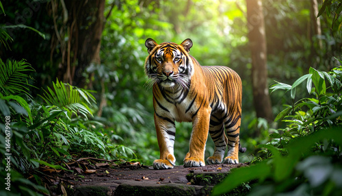 a tiger standing in a dense jungle. the tiger is a striking figure with its distinctive orange and black fur patterned across its body