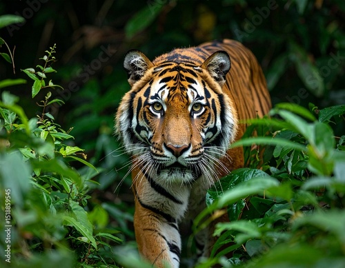 A tiger walking through dense green foliage looking directly at the viewer in a natural habitat