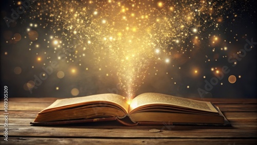 A Timeless Tale Unveiled An Open Book Radiating Enchanting Golden Light and Sparkling Dust on a Rustic Wooden Surface