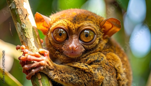 A tiny, brown tarsier clinging to a branch with huge eyes staring straight ahead