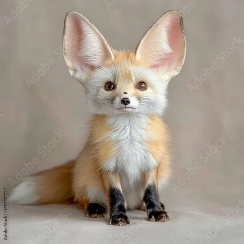 A tiny fennec fox with oversized ears, sandy fur glowing, warm beige background, copy space on the right,