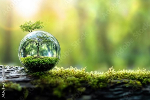 A tiny tree growing inside a glass sphere resting on moss in a lush forest setting during daylight