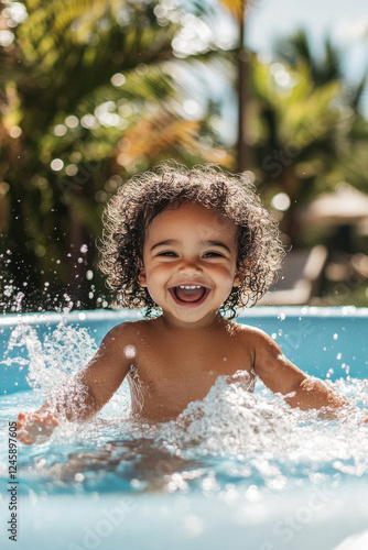 A toddler sitting in a kiddie pool, splashing water that turns into playful shapes