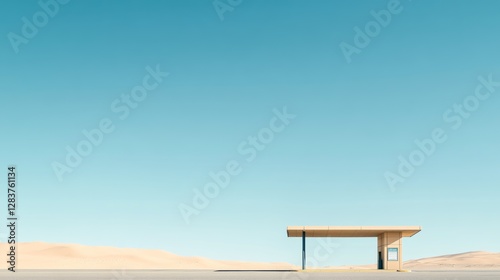 A toll booth in a desert landscape with vast sand dunes. Featuring no cars and a clear blue sky
