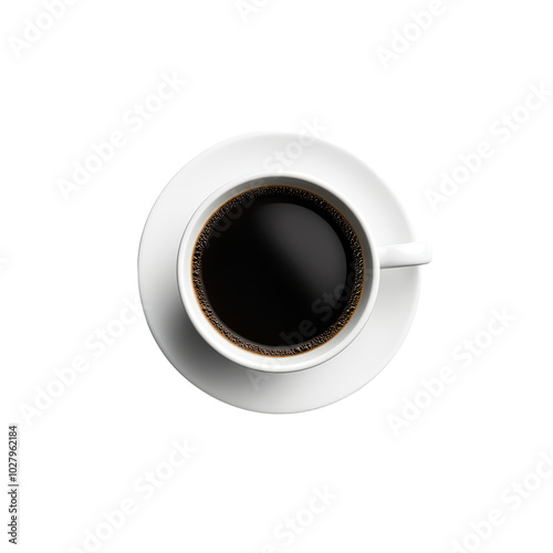 A top view of a cup of black coffee on a white saucer against a black background. isolated on transparent background.