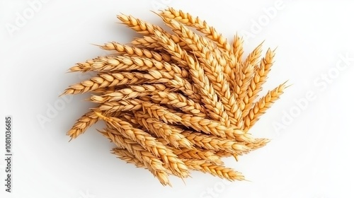 A top view of a natural pile of golden wheat grains in a rounded shape, against a clean white background
