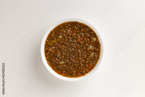 A top view of a round white bowl filled with lentil soup, set against a white background. Simple, clean design, perfect for food styling, product mockups, or promotional use.