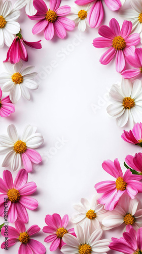 A top view of wild pink and white flowers, chaotically arranged around empty space for text, framed by nature beauty with a clean white background, offering a fresh, minimal feel
