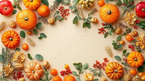 A top view photo capturing the essence of autumn harvest with raw vegetables, pumpkins, rowan berries, walnuts, physalis, and wheat on an isolated beige background