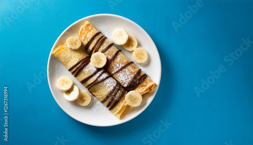 a top view photo of a plate with folded crepes drizzled in chocolate sauce garnished with powdered sugar dusted banana slices the dish is served on a white plate against a bright blue background