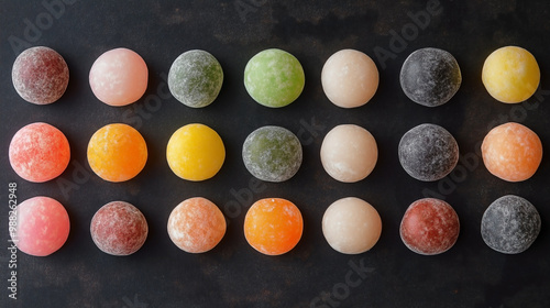 A top-down, flat-lay view of various colored mochi arranged neatly on a dark table background.