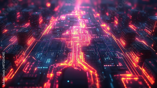 A top-down view of a smart city powered by AI, with glowing neon circuits connecting every structure and transportation system. The digital network pulses with vibrant energy,