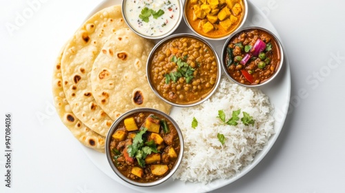 A top-down view of a traditional Indian thali with various dishes like dal, vegetable curry, rice, and chapati, arranged neatly on a white plate, highlighting the variety and richness.