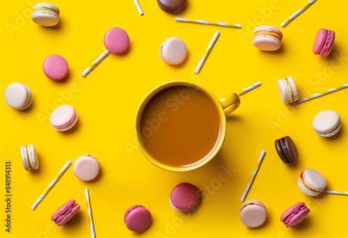 A top-down view of a yellow coffee cup, straws, and french macarons on a yellow background