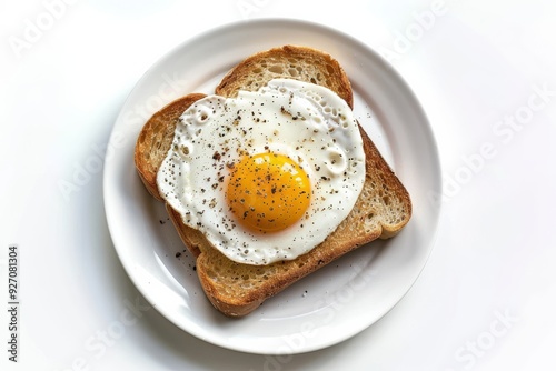 A top-view image of a perfectly cooked fried egg on a toasted slice of bread, served on a white plate against a clean, white background