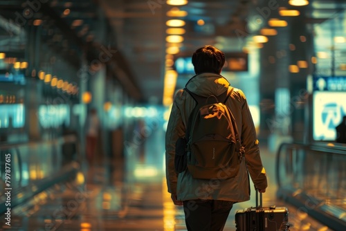 A tourist is walking down a hallway with a suitcase