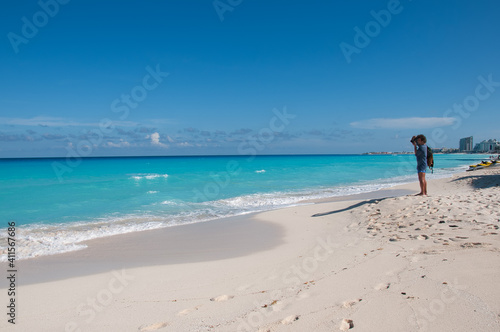 A tourist on a beach in Cancun, Mexico, takes a picture of the turquoise sea. In the background the a blue sky and few clouds. An ideal place to relax with nature.