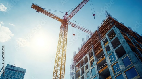 A towering crane stands tall against a backdrop of a modern high-rise under construction.