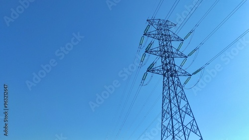 A towering electricity pylon stretches into the clear blue sky, its high-voltage power lines running across the scene, symbolizing the vast energy network that powers modern life