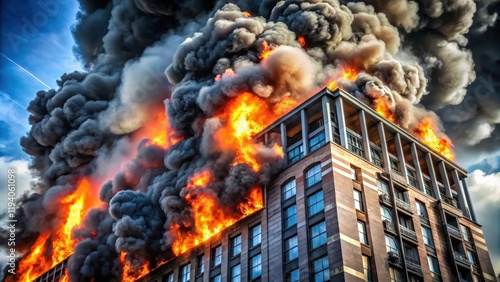A towering inferno engulfs a multi-story building, billowing smoke obscuring the sky while flames lick at the windows