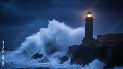 A towering lighthouse on a rocky cliff, with waves crashing against the rocks below, and light beaming through the stormy night.