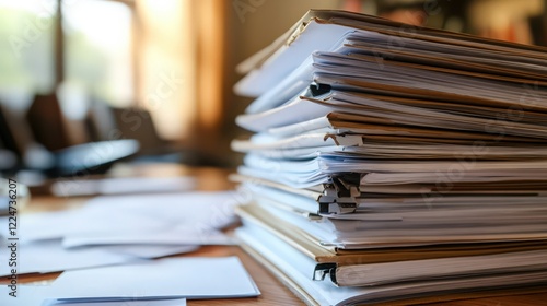 A towering stack of office documents sitting on a wooden desk under bright lighting