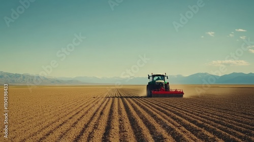 A tractor pulling a row planter in a freshly plowed field, with seeds being planted evenly