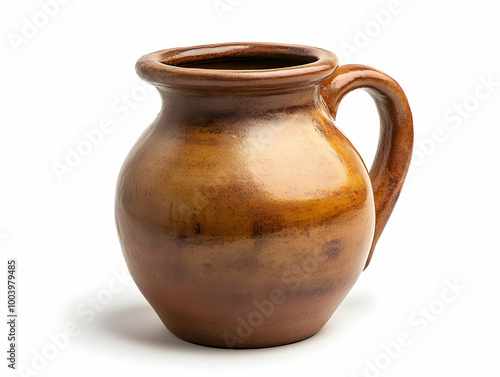 A traditional clay jug with a rounded body and a handle, perfect for serving beverages, against a white isolated background.