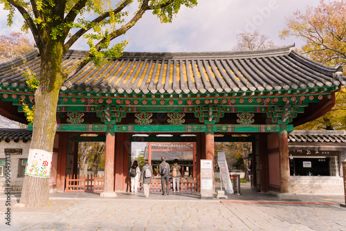 a traditional Korean gate at Jeonju, adorned with intricate designs, nestled under a vibrant yellow ginkgo tree, against a clear sky, reflecting cultural heritage and natural