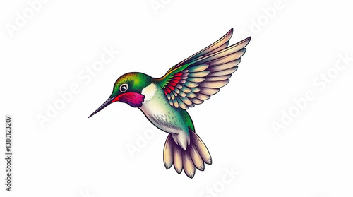 A traditional tattoo-style print of a hummingbird, isolated on a white background, depicting a soft dreamy atmosphere in vibrant colors with a retro flair, complex ornamental details, hazy, soft light