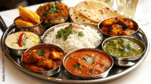 A traditional thali platter, featuring a selection of Indian dishes such as dal, paneer tikka, aloo gobi, and roti, offering a feast for the senses.