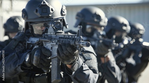 A training scene at a police academy showing recruits handling various types of law enforcement equipment.