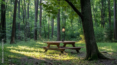 A tranquil forest clearing with a wooden picnic table and a lantern hanging from a tree
