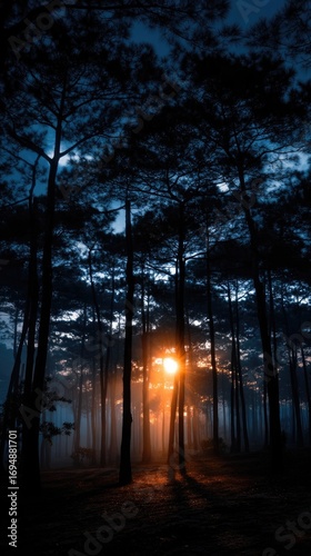 A tranquil forest filled with towering trees and mist, illuminated by soft light as dusk approaches, creating a serene atmosphere