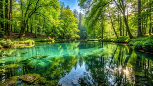 A tranquil forest glade with a crystal-clear pool reflecting lush greenery above, forest, glade, misty, hidden, crystal-clear