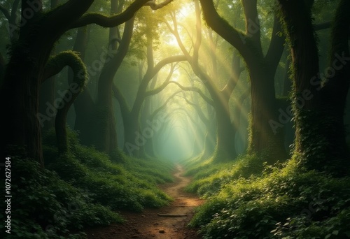 A tranquil forest path illuminated by soft sunlight filtering through lush green trees during early morning hours