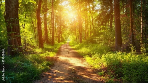 A tranquil forest path with sunlight streaming through the trees, perfect for outdoor walks. High quality images
