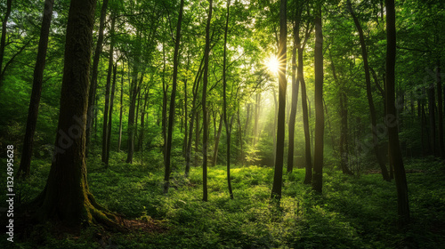 A tranquil forest scene featuring lush green trees, evoking a sense of peace and serenity