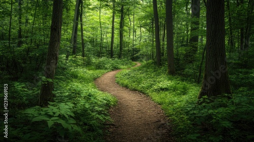 A tranquil forest trail surrounded by thick, diverse vegetation, emphasizing the beauty of natural ecosystems and the harmonious coexistence of all living things.